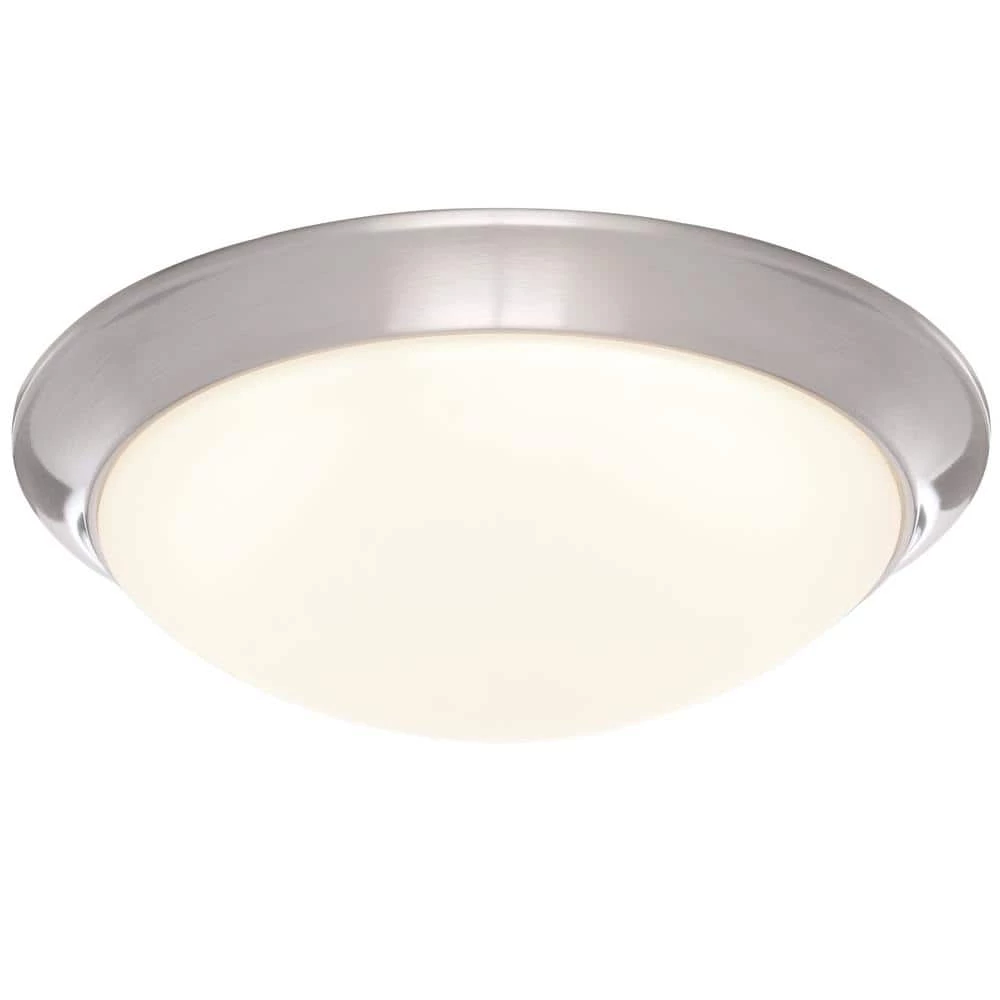 The Commercial Electric Brushed Nickel Finish 11 in. LED Flushmount with frosted white glass is designed to look great in any room while save you money at the same time. This dimmable, 12 in. round ceiling mounted light features a brushed nickel finish and sleek white glass diffuser. The integrated LED light source reduces energy consumption by 70 percent. Because there are no bulbs to replace, it saves you time and money.