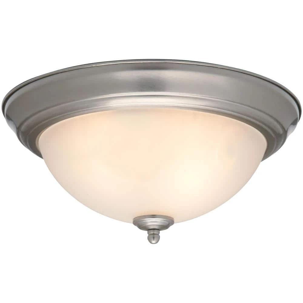 The Commercial Electric twin pack Flush Mount is a great look at a great value. From the professional to the do-it-yourselfer, the twin pack flushmount is an exceptional choice. Each Flush Mount is finished in Brushed Nickel with frosted white glass. Each Flush Mount uses two 60-Watt medium-base light bulbs. From kitchen to bath or any room in between, the CE Brushed Nickel twin pack will not only enhance but will save cost to your home as well.