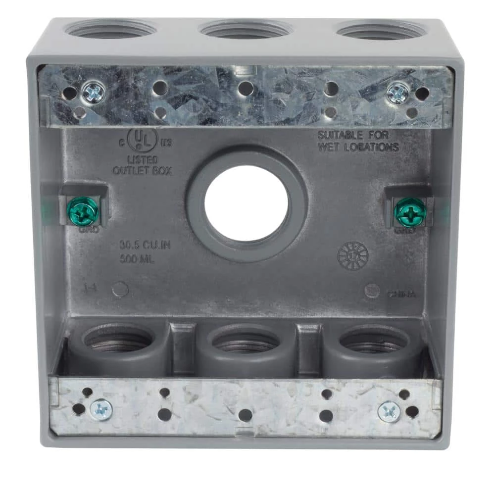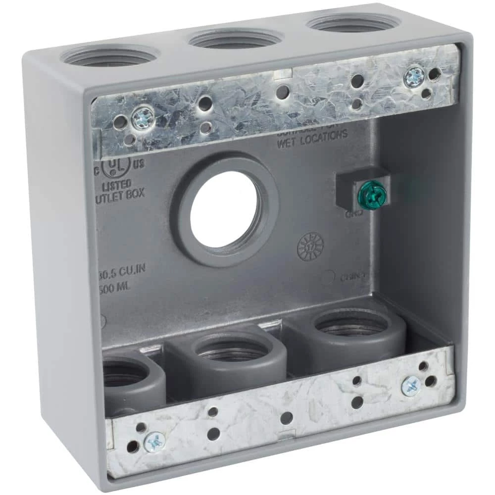 Commercial Electric weatherproof boxes are designed for use in branch circuit wiring in wet, damp or dry locations. Boxes house receptacles, switches and GFCI’s. Boxes may also be used as a weatherproof junction box. Closure plugs and installation hardware included.