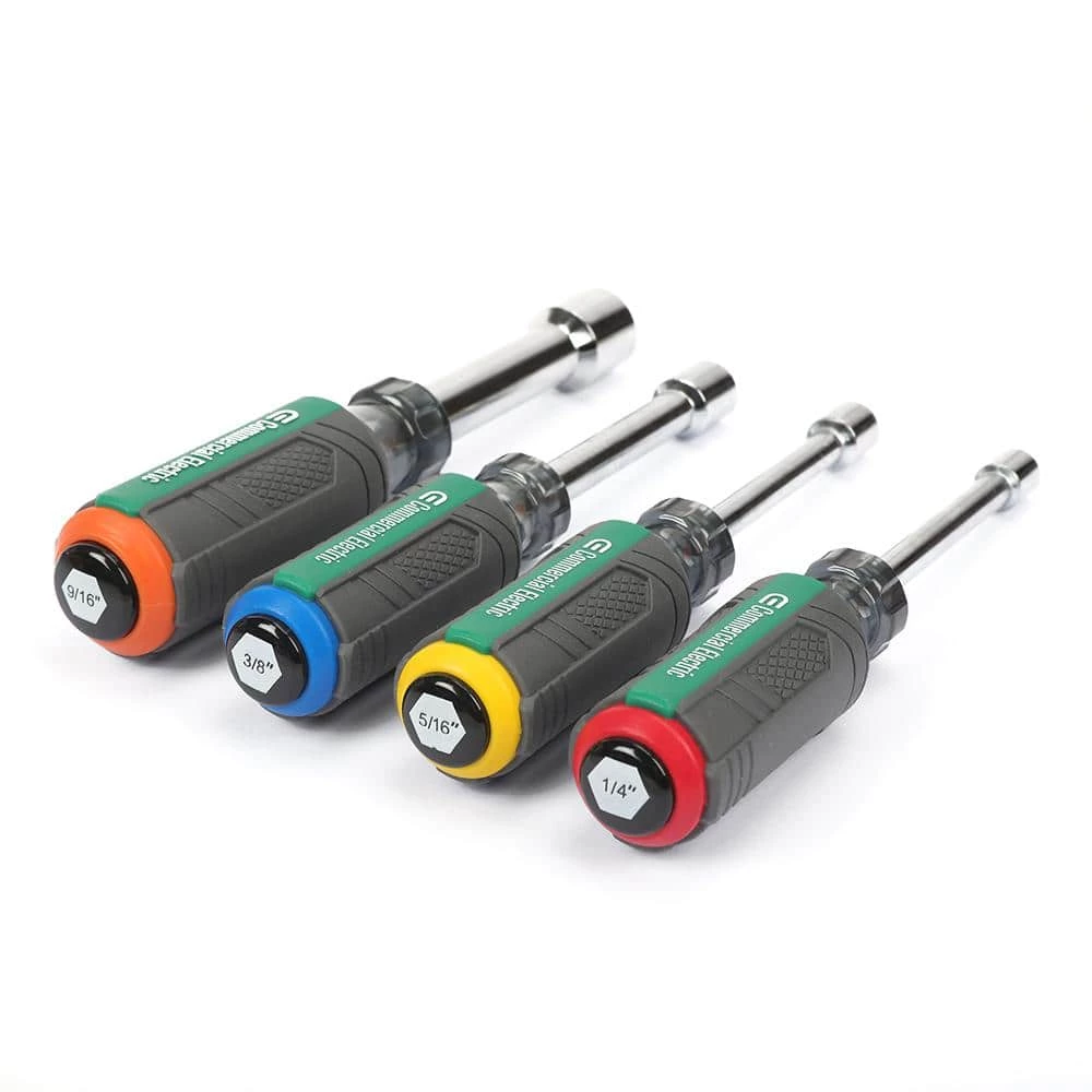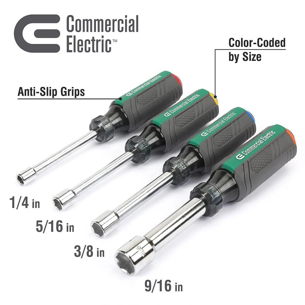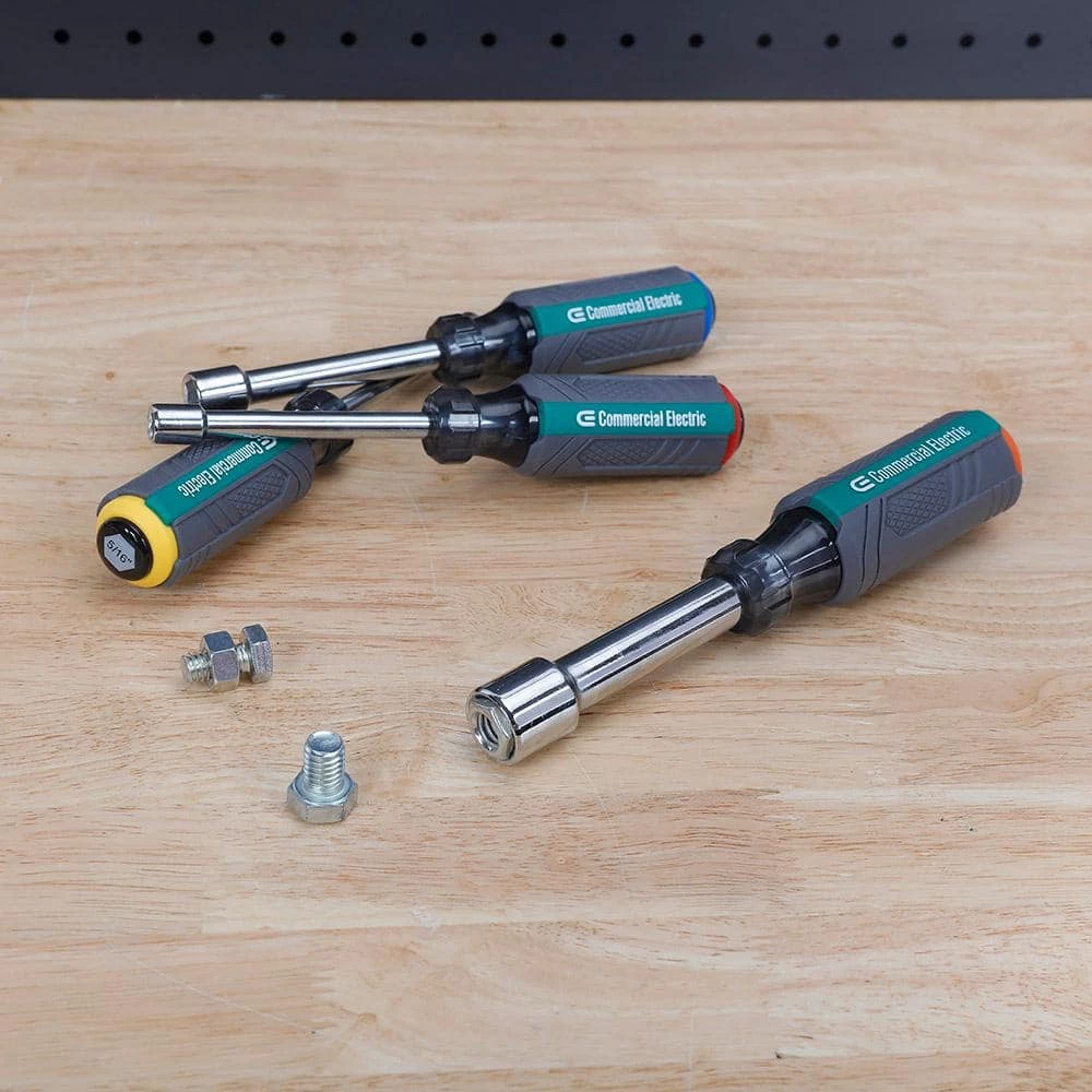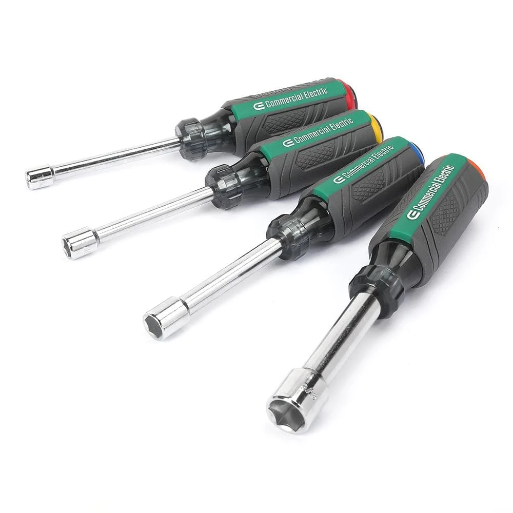 The Commercial Electric 4-Piece Nut Drivers includes 4 high quality standard size nut drivers that are color-coded for easy identification. Ergonomic anti-slip grips makes for comfortable use over extended periods. Perfect tool for the home, workshop or jobsite.