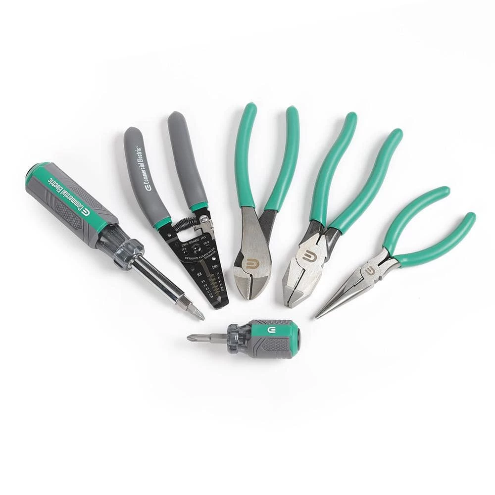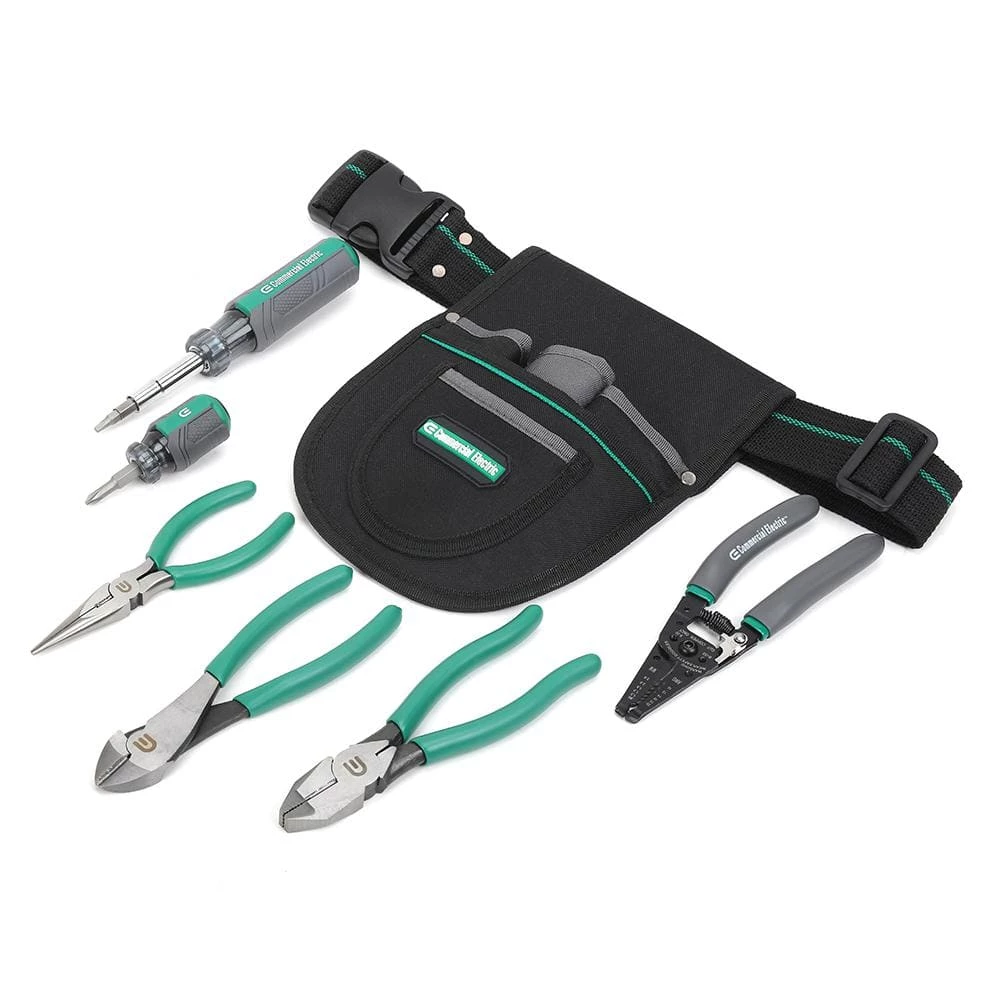 The Commercial Electric 7-Piece Electrician’s Tool Set is a great assortment of electrical tools that are perfect for the home, workshop or jobsite. The included 6 pocket tool pouch keeps tools organized and readily available with the convenient waist strap attachment. No more trips up and down the ladder constantly searching for tools.