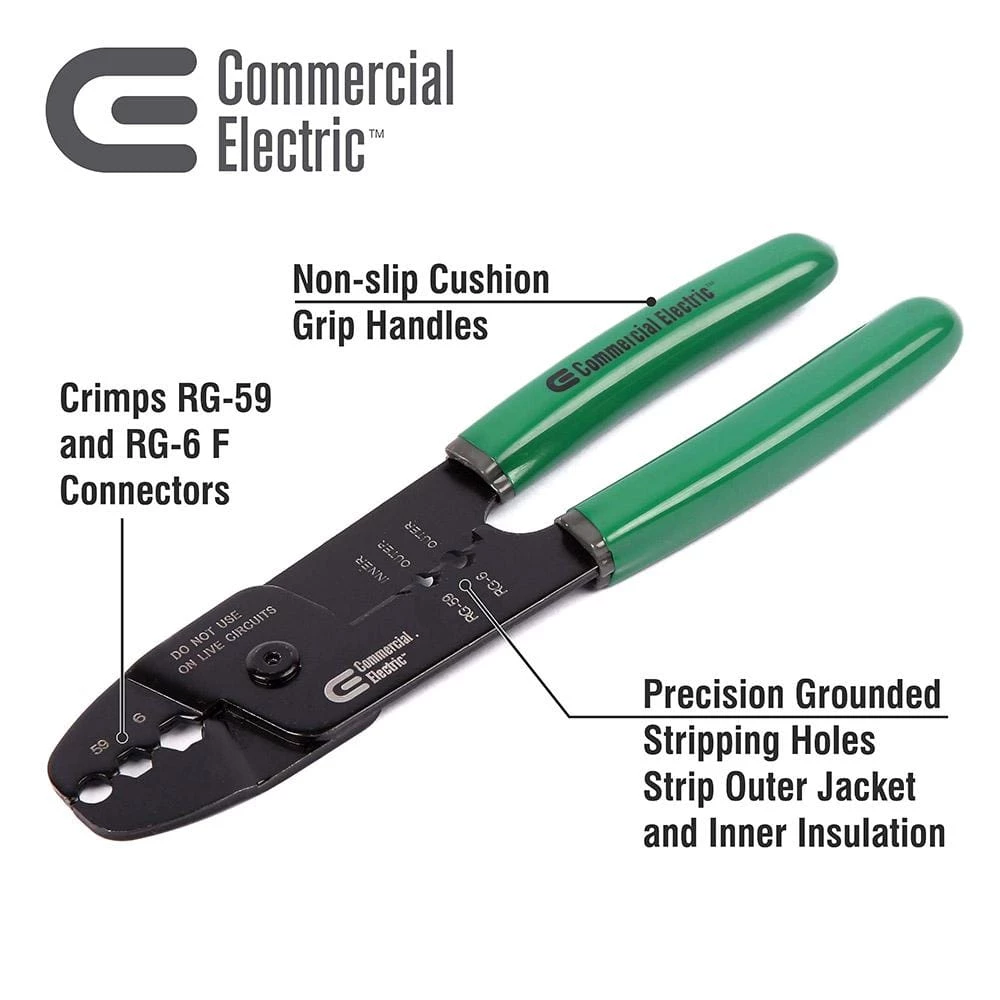 The Coaxial Strip and Crimp Tool from Commercial Electric is designed to quickly and easily remove the outer jacket and insulation from coaxial cable. Precision-grounded stripping holes remove the outer jacket and insulation for RG-59 and RG-6 coaxial cable. The tool offers 3 crimping nest for crimping both F-connectors and ring terminals. Tough and durable blades are perfect for cutting copper-coated steel conductors. Ergonomic and comfortable handle design provides a non-slip grip.