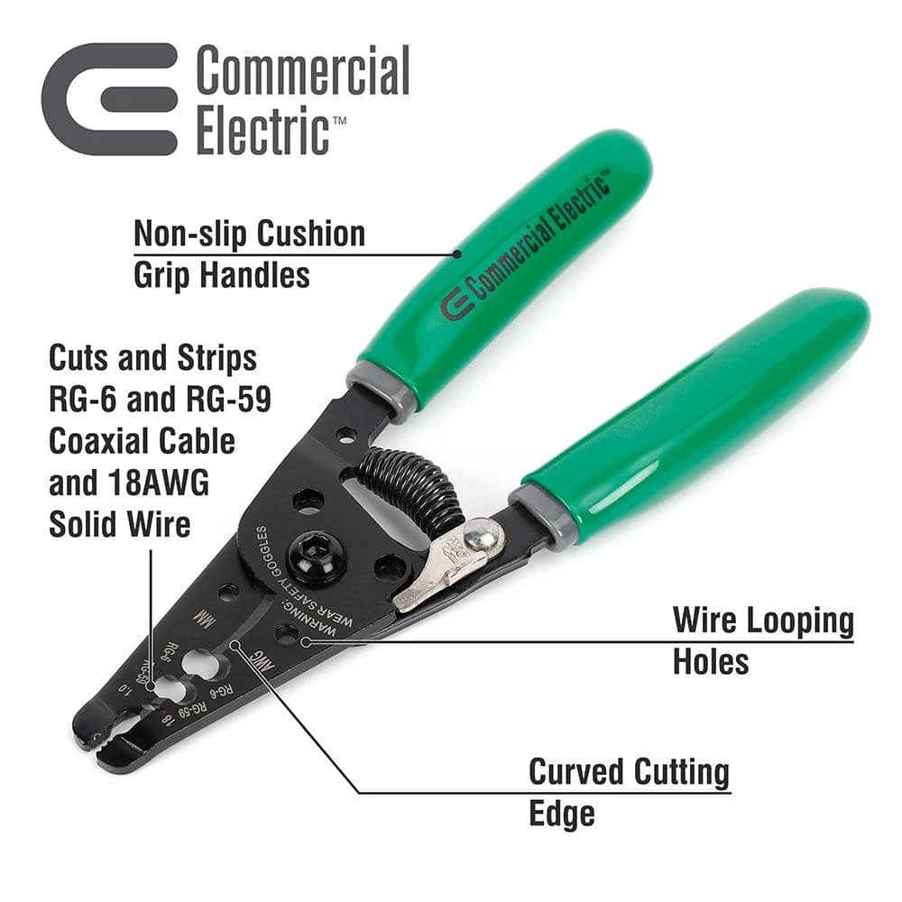 - Cuts and strips RG-59 and RG-6 coaxial cable