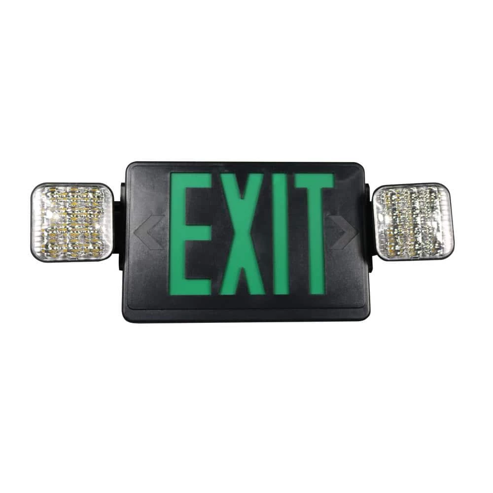 All LED Red / Green Exit Emergency Combo. The Commercial Electric Black All-LED Exit and Emergency Combination unit is perfect for applications requiring an Exit sign and emergency light in the same area. The High quality LEDs and battery backup make this unit virtually maintenance free. As an added feature this unit is equipped with both red and green stencils to accommodate local code requirements. It can be wall, top or end mounted.