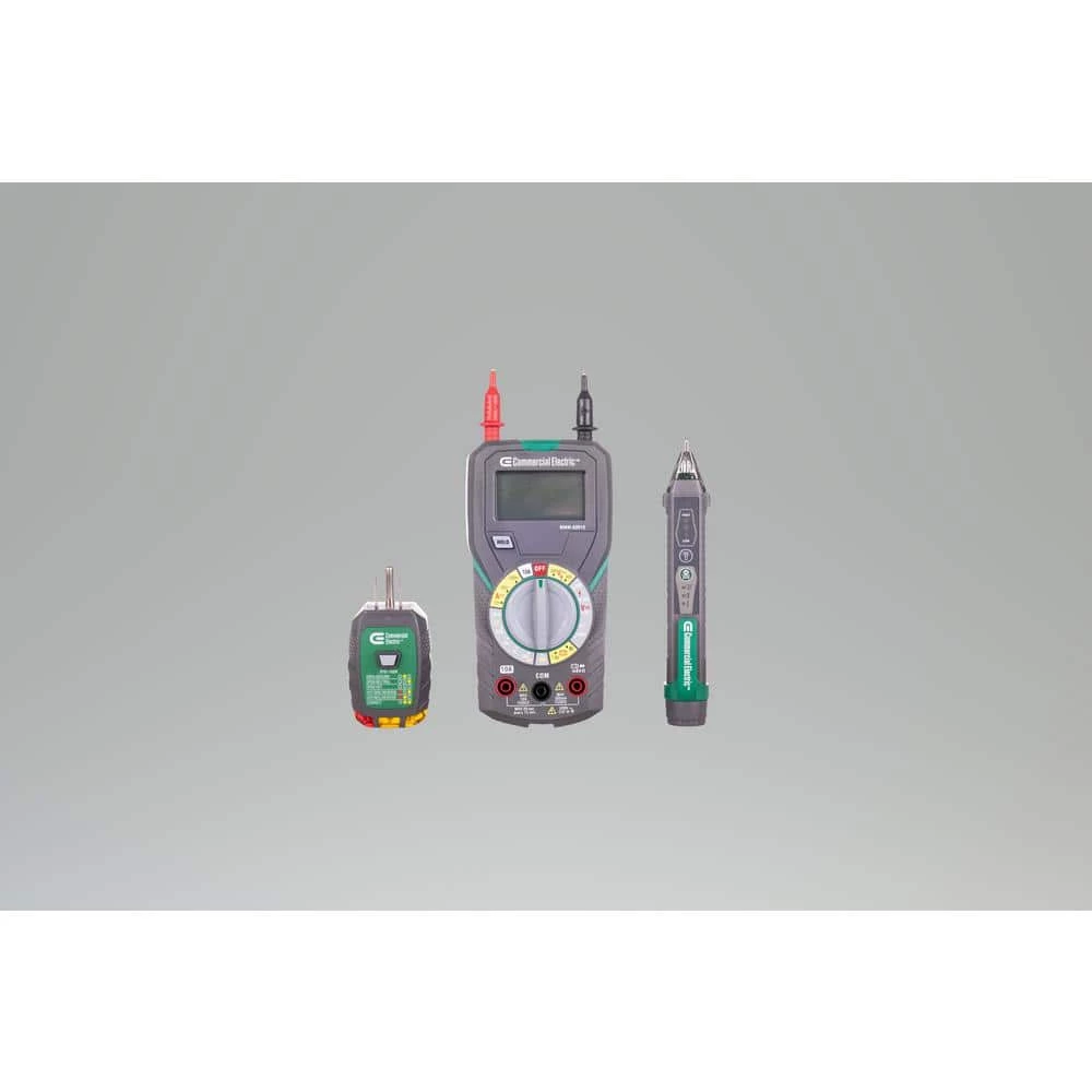 Commercial Electric Maintenance Kit contains MMM-8301S ( Manual Ranging Multimeter), NCVT-8908R ( Non-Contact AC Voltage detector, OTG-102R ( GFCI Outlet tester). The kit provides convenient and ideal for household repair, technician maintenance and electrical troubleshooting. Durable shell design and easy to use.