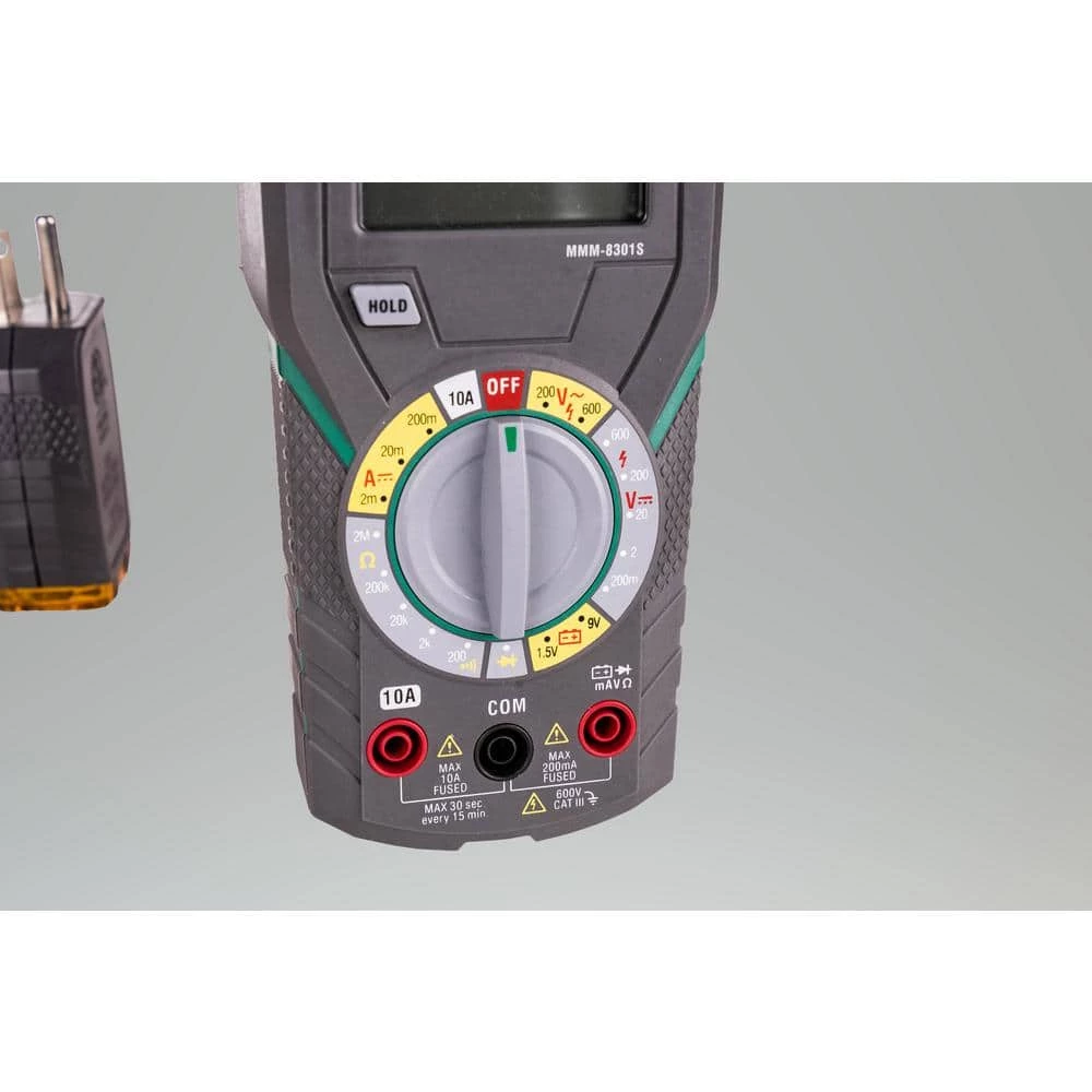 - MMM-8301S manual ranging multimeter test up to 600-Volt AC/DC voltage, 10 Amp DC current, resistance, diode, continuity